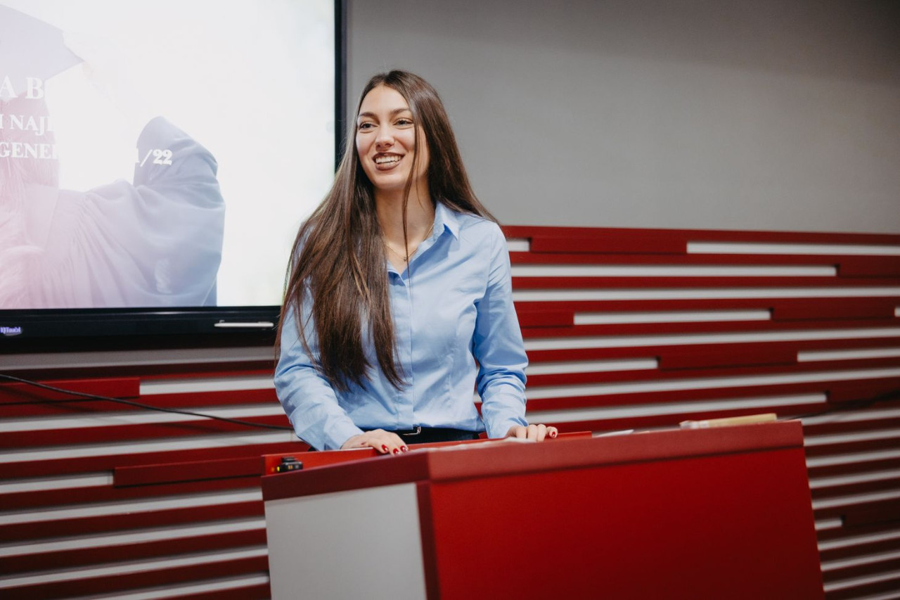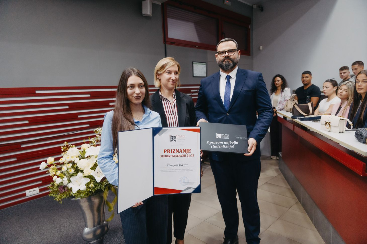 Na kraju oficijelnog dela programa proglašena je i studentkinja generacije 21/22. Simona Basta, kojoj su za izvanredan uspeh, prosečnu ocenu 9.92, kao i učešće u brojnim vannastavnim aktivnostima, prof. dr Jelena Stojšić Dabetić i Luka Radulović uručili priznanje i prigodan poklon. Nakon uručenja, Simona Basta, s pravom najbolja studentkinja, obratila se novoj generaciji studenata i preporučila im da iskoriste sve mogućnosti koje Fakultet pruža, jer su mnogobrojne. „Budite radoznali, aktivni i istrajni, jer se trud prepoznaje. Svakako će na tom putu biti izazova, ali i grešaka. Greške koje se prave na fakultetu nisu skupe, te vas savetujem da budete samokritični, ali ne previse strogi prema sebi. Verujem da ćete jednog dana reći da je upis na ovaj fakultet bio početak vaših najvećih profesionalnih i životnih postignuća.“
