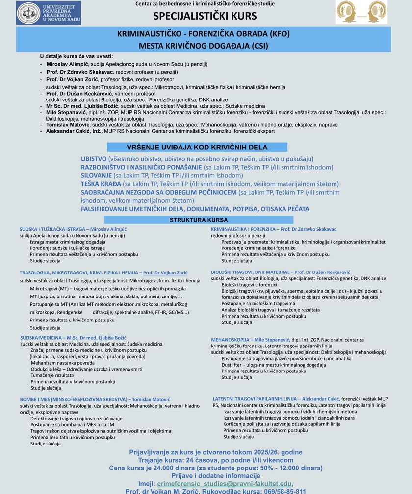 Savremeno društvo se sve više i svakodnevno suočava sa krivičnim delima. Pravilna edukacija pojedinaca zaposlenih u stručnim službama pomoći će efikasnom pronalasku izvršioca krivičnih dela, njegovom procesuiranju i sankcionisanju. Pravni fakultet za privredu i pravosuđe u Novom Sadu i Centar za bezbednosne i kriminalističko-forenzičke studije organizovali su specijalistički kurs „KRIMINALISTIČKO - FORENZIČKA OBRADA (KFO) MESTA KRIVIČNOG DOGAĐAJA (CSI)“.