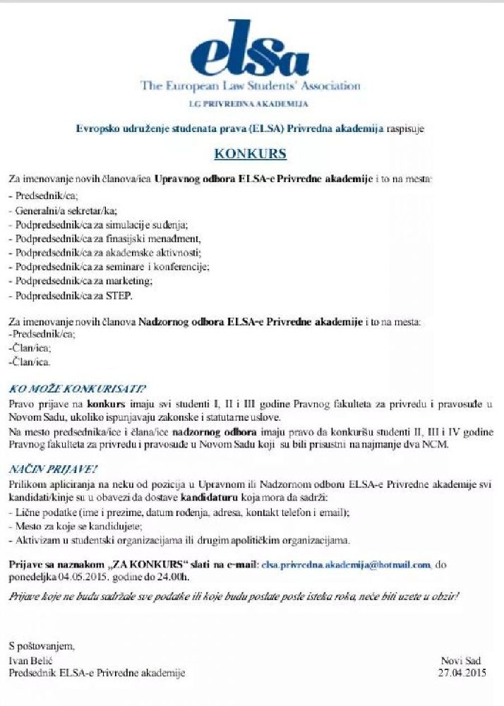 Konkurs za imenovanje novih članova Upravnog odbora ELSA-e Privredne akademije.