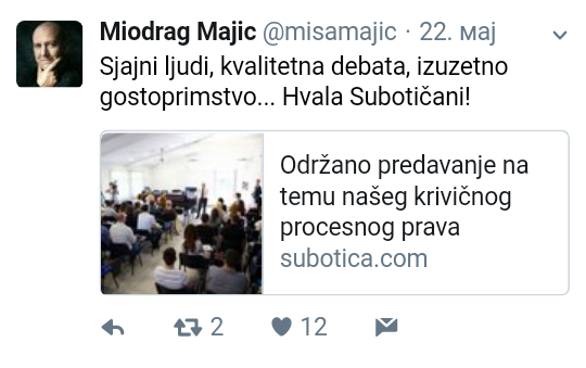 Pravni fakultet za privredu i pravosuđe u Novom Sadu u Subotici, organizovao je danas otvoreno predavanje pod nazivom „Aktuelna pitanja našeg krivičnog procesnog prava“. Predavanje je držao dr Miodrag Majić, sudija Apelacionog suda u Beogradu.