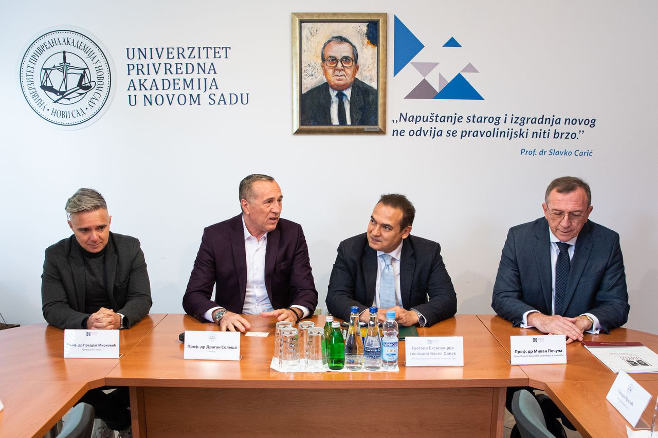 Njegova Ekselencija gospodin Basel Salah, Ambasador Arapske Republike Egipat u Srbiji posetio je Pravni fakultet za privredu i pravosuđe u Novom Sadu u četvrtak, 18. aprila 2024. godine gde su ga svečano dočekali prof. dr Dragan Soleša, rektor Univerziteta Privredna akademija, prof. dr Milan Počuča, dekan Pravnog fakulteta za privredu i pravosuđe, prof. dr Predrag Mirković, predsednik Saveta Pravnog fakulteta za privredu i pravosuđe, prof. dr Sanja Škorić, prodekanka za nastavu Pravnog fakulteta za privredu i pravosuđe i Tamara Krstić, direktorka marketinga Univerziteta Privredna akademija.