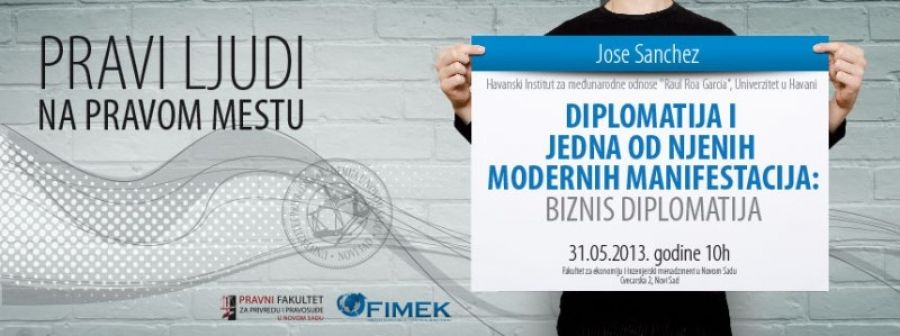 sa velikim zadovoljstvom vas pozivamo da prisustvujete tribini „Pravi ljudi na pravom mestu“ u okviru koje će prof. dr Jose Sanchez održati predavanje na temu "Diplomatija i jedna od njenih modernih manifestacija: biznis diplomatija" . Tribina će se održati 31.05.2013. godine u Amfiteatru „Prof. dr Slavko Carić“ sa početkom u 10h.