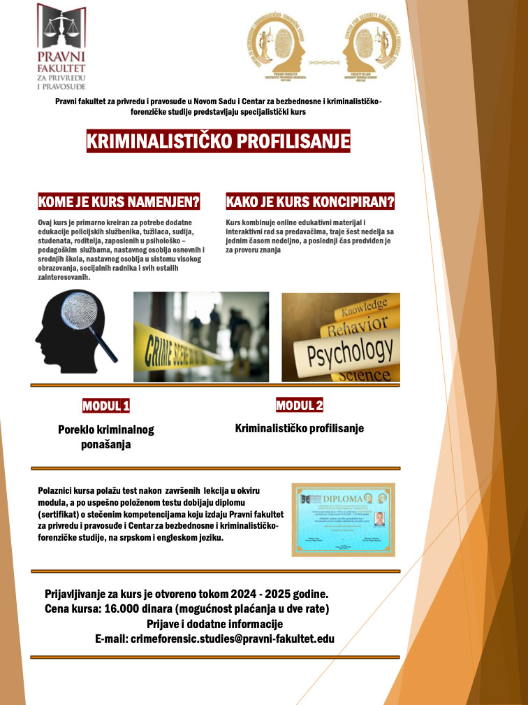 Uvažavajući aktuelne društvene izazove i potrebu delotvornog odgovora za sprečavanje nasilja, posvećeni misiji da obrazovanje ima smisla samo ukoliko ide u korak sa društvenim tokovima, svesni uticaja koji imamo za dugoročni prosperitet mladih, motivisani za edukaciju i transfer znanja, Pravni fakultet za privredu i pravosuđe u Novom Sadu i Centar za bezbednosne i kriminalističko-forenzičke studije predstavljaju specijalistički kurs „Kriminalističko profilisanje“.